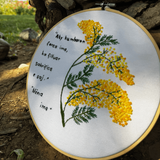 Punime artizanale të realizuara me fije moline në gjergjef, në masa të ndryshme, të dekoruara me simbole natyrore apo kombëtare. Dizajnet përfshijnë degë mimoze të verdha të qëndisura me kujdes dhe formën e hartës së Shqipërisë me shqiponjën qëndrore, duke sjellë një ndjesi identiteti, përkatësie dhe elegancë. Ky produkt është i punuar me dorë në çdo detaj dhe mund të vendoset si dekor muri, tavoline apo të dhurohet për raste simbolike.