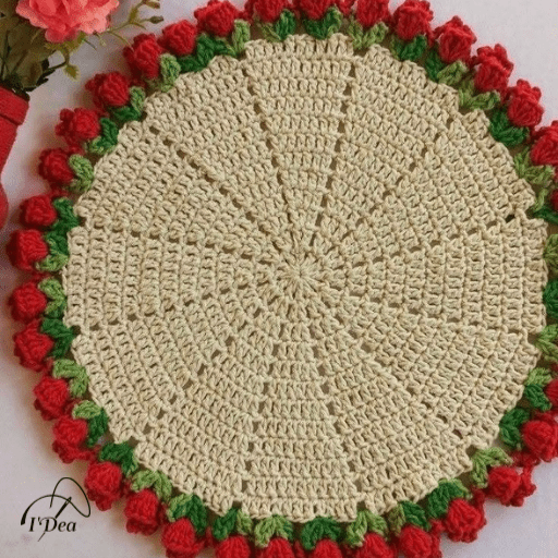 Përshkrimi: Mbajtëse elegante për pjatat, të punuara me grep në formë rrethore me detaje lulesh në bordurë. Një element dekorativ që sjell freski dhe ngrohtësi në tryezën tuaj. Materiali pambuk cilësor, i qëndrueshëm dhe antialergjik. Ngjyrat mund të përshtaten sipas dëshirës suaj.
